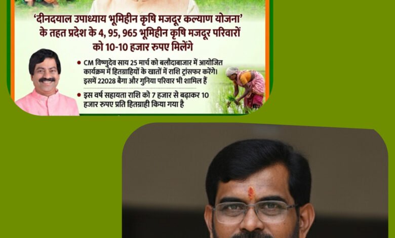 छत्तीसगढ़ के मुख्यमंत्री विष्णुदेव साय की सरकार ‘दीनदयाल उपाध्याय भूमिहीन कृषि मजदूर कल्याण योजना’ के तहत प्रदेश के करीब 5 लाख भूमिहीन कृषि मजदूर परिवारों को बड़ी आर्थिक सहायता देने जा रही है।
